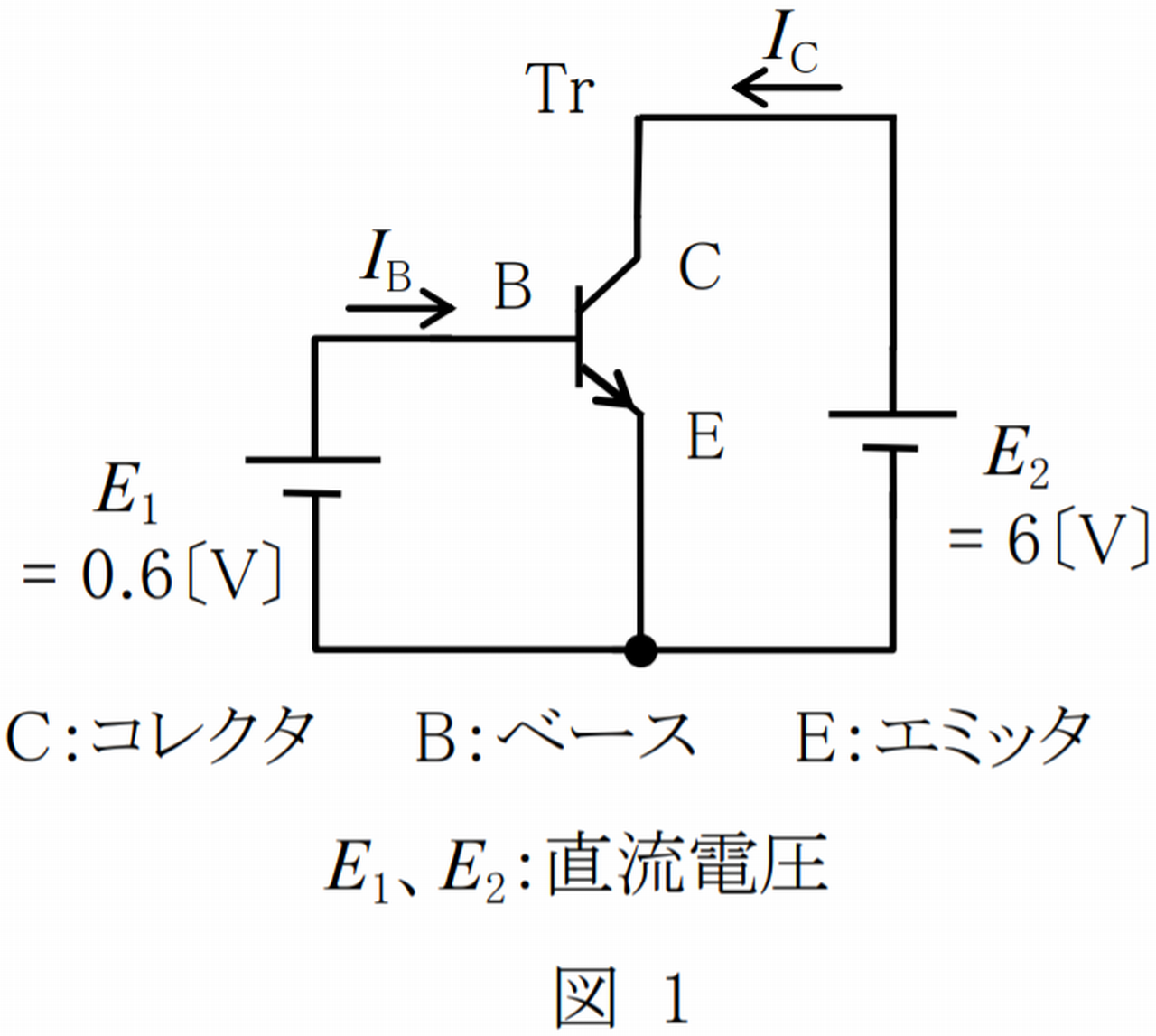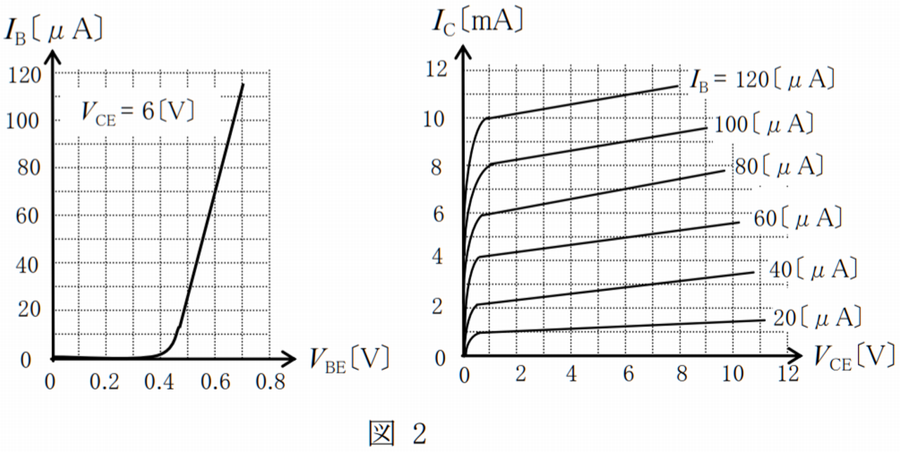 図 1 に示すトランジスタ(Tr)回路のコレクタ電流 IC の値として、最も近いものを下の番号から選べ。ただし、トランジスタの特性は、図 2 に示すものとする。また、ベース電流を IB、ベース-エミッタ間電圧を VBE及びコレクタ-エミッタ間電圧を VCE とする。